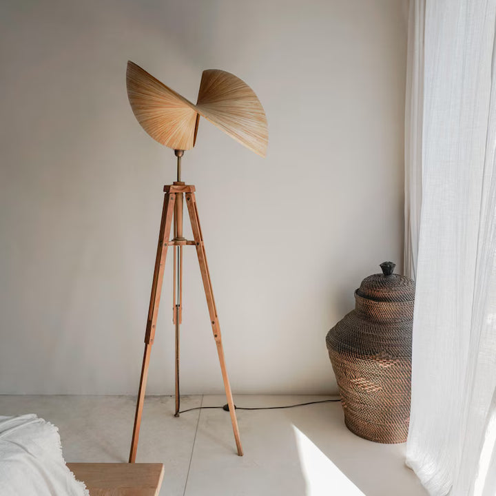 Lampa Reed Dream to wyjątkowa lampa podłogowa, która urzeka naturalną formą i eleganckim stylem boho. Klosz wykonany z cienkich warstw bambusa tworzy falujące kształty, które pozwalają światłu delikatnie i nastrojowo rozpływać się po pomieszczeniu. To połączenie kunsztu wykonania i subtelnej nowoczesności.