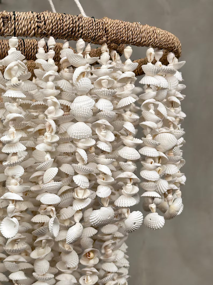 muszelek Nassa, delikatnie oplatających filigranową, metalową ramę. Subtelna